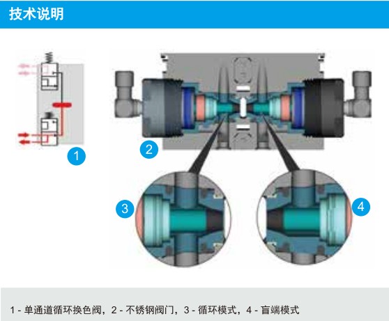 EcoMCC3换色阀的每种颜色可配置为截止端或循环系统。颜色可配置为循环阀。可以通过只更换阀门来改变颜色循环或者盲端,而不用改变整个换色阀。
